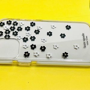 Stylish kate spade phone case. Features black and white floral design. Durable and chic.