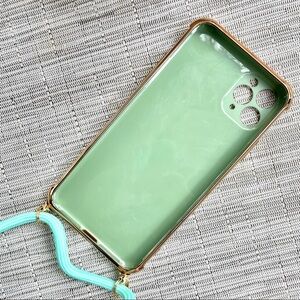 iPhone 11ProMax sage & gold crossbody phone case with adjustable aqua cord makes this phone case so versatile! Wear it cross body or around your neck. Gold details and Rocknicu Good Luck For You printed on the back.
