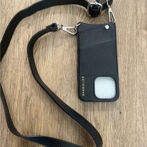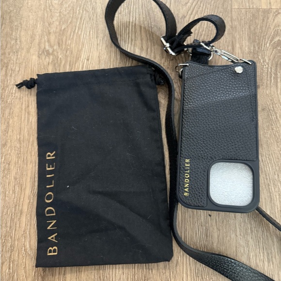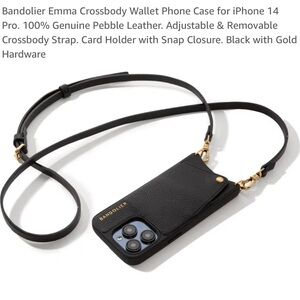 Stylish black crossbody phone case by Bandolier. Style - Emma. Features a sleek design with a convenient strap. Fits IPHONE 14. Brand spanking new!