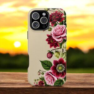 Adorn your phone with this stunning case featuring vibrant pink roses and red dahlias on a soft beige background. Perfect for lovers of timeless floral elegance, this phone case offers a blend of artistic beauty and reliable protection.