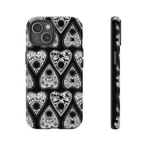 Channel spooky season energy year-round with this gothic Ouija board collage phone case. Featuring intricately illustrated planchettes in black and white, this tough protective cover is perfect for iPhone 15. Available in glossy finish, it blends horror and elegance with a subtle witchy flair. A perfect Halloween phone case, gift for teenage girls, or must-have for fans of bookish vibes, spiritual symbolism, or goth aesthetic.