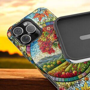 Celebrate the beauty of autumn with this stunning phone case featuring a stained glass-inspired design of a colorful tree and rolling hills. This vibrant and artistic case is perfect for nature lovers and adds durable protection with a unique touch.