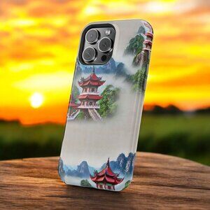 Transport yourself to serene landscapes with this oriental pagoda phone case. Featuring intricate temple designs amidst misty mountains, this case adds a touch of artistic beauty to your phone while ensuring durable protection. Perfect for lovers of Asian-inspired art.