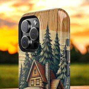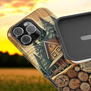 Embrace the cozy charm of the great outdoors with this rustic phone case featuring a log cabin surrounded by lush pine trees. Perfect for nature enthusiasts, this unique design adds warmth and personality while offering reliable phone protection.