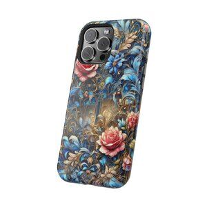 Indulge in sophistication with this luxurious floral baroque phone case. Featuring ornate blue and gold patterns adorned with vibrant roses, this design is perfect for art and fashion enthusiasts seeking timeless elegance.