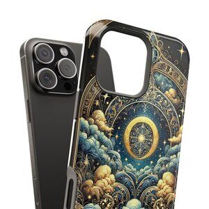 Dive into the cosmos with this stunning phone case featuring a golden moon surrounded by celestial clouds and intricate details. Perfect for stargazers and dreamers, this artistic case adds cosmic beauty and reliable protection to your device.
