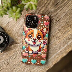 Spread love with this adorable corgi phone case, featuring a cute cartoon design surrounded by colorful hearts. Perfect for dog lovers and fans of kawaii pet accessories, this case provides both charm and reliable protection.
