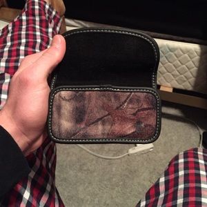 This camouflage carry case is for a iPhone 4. The sturdy belt clip allows you to fasten anywhere on pants, shorts, etc. The flap is closed with a magnet allowing for quiet and easy access to your device.