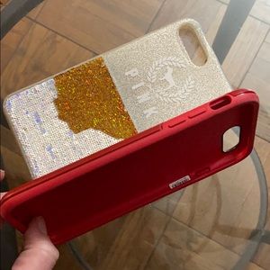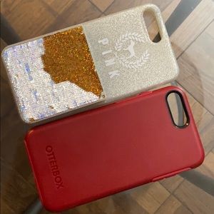 One Victoria’s Secret PINK phone case and one red otter box case. VERY gently used. Great condition. These were used on an iPhone 7+. I believe they would fit the 6+ and 8+ iPhones as well.