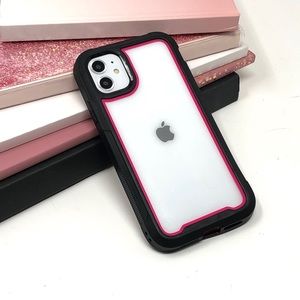 New iPhone Defender Bumper Case. 2 Layer Protection Bumper Case. Inner PC Frame Protects the Edges While The Outer TPU Frame Provides Primary Protection. Raised Lip Protects the Front of Case. Black Frame with Outlines of Pink. Clear Acrylic Back Allows You To Showcase The Color of Your Phone. This Case is Compatible with Wireless Charging Devices. Pretty and Protective :)