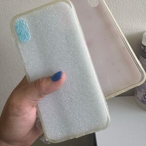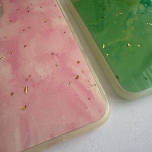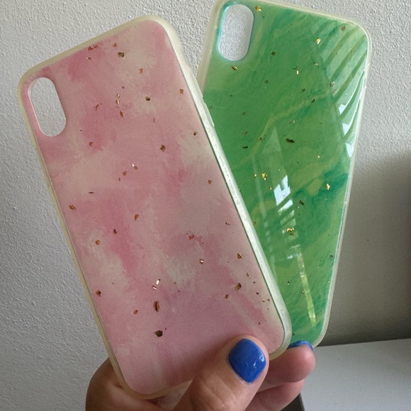 Stylish iPhone XR case bundle including 2 soft TPU cases: one in pink marble and one in green marble, both accented with embedded gold foil flakes. Gently used and in great condition. Snug fit, easy to install, and lightweight protection.