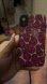 iPhone XR Case that has pink & black smiley face on the back of it.
