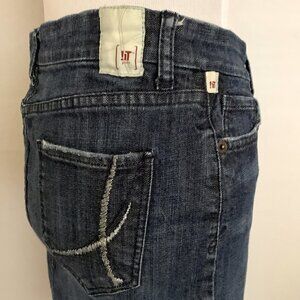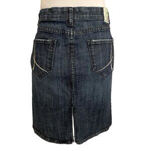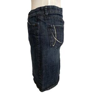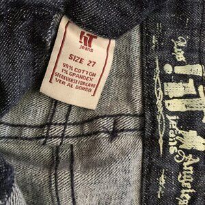Los Angeles !iT Jeans Skirt: Cute distressed A-line denim skirt has five pockets with embroidery on the back pockets, back slit, flat zipper front.