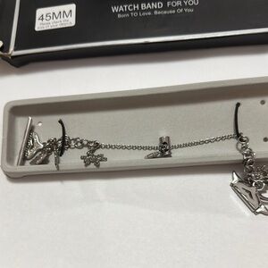 iWatch 45MM Charm Bracelet watch band with bedazzled watch face protector. Pre-owned comes with box and in good condition. Charms are removable or you can add more charms. This is such a cute watch band that usually cost over $50 retail.
