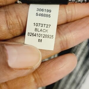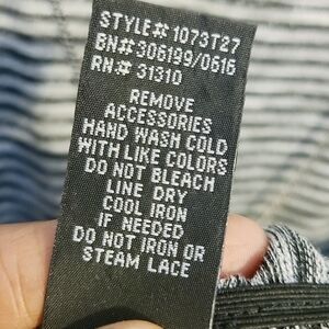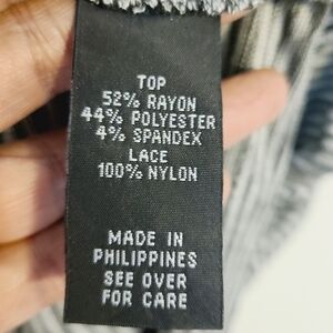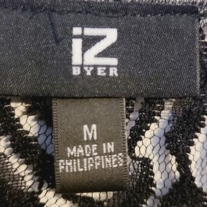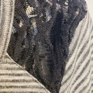 Women's black and gray, striped, tab-sleeved shirt by iZ Byer, size medium. Lace detailing in the back and attached medallion style necklace at collar. The shirt is cinched on the sides and is a blend of rayon, nylon, polyester, and spandex. Excellent pre-owned condition overall; small snag in the lace that's barely noticeable. Please see close-up pictures for more details.