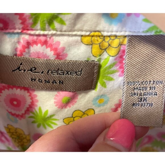 • Tags: Relaxed Woman brand, size 3X, multicolor top, striped blouse, 3/4 sleeve top, casual style, button-up blouse, cotton material, comfortable wear, plus size clothing, women's clothing, striped 3/4 sleeve top, colorful button-up top