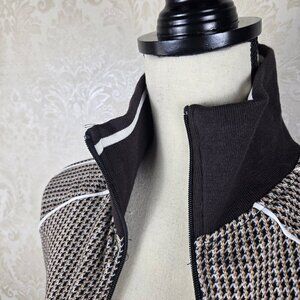 Brown houndstooth jacket has a zip front. The collar is adjustable and can stand up or lay down. Knit collar, bottom hem and cuffs are all brown with a white stripe. White accents along the shoulders and down the sleeves. Two zippered pockets on the front. NWT from Urban Outfitters in the UK.