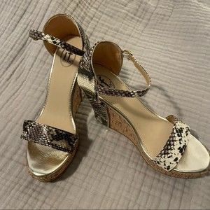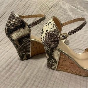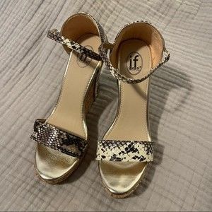 Style 17-635 by if Carrini platform wedge sandals with ankle strap and cork wedge accents. Stunning black and white snakeskin print with gold trim. 1.25” platform and 4.5” heel. Only worn a few times. Includes original box.