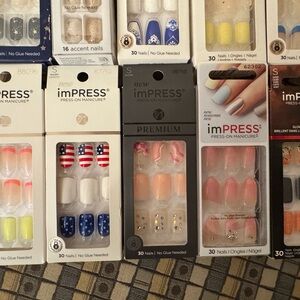 Set of 10 new ImPRESS branded press-on nail sets in assorted styles and colors. Includes solid, glitter, floral, and flag-inspired nail designs. Ready-to-wear adhesive nails for quick application. Variety pack offers diverse looks for different occasions.