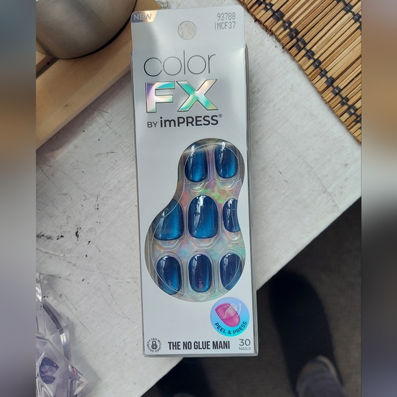 Vibrant blue nails by imPRESS. Easy peel and press application. Includes 30 nails for a bold look.