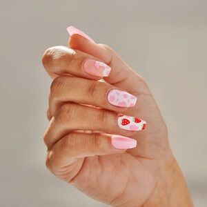 Nail kit contains 30 perfectly manicured press on nails, prep pad, mini nail file, and manicure stick