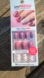 Stylish press-on nails with pinkish maroon and white designs. Easy application with no glue needed. Includes 30 nails in various sizes with 6 accent pieces.