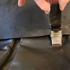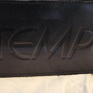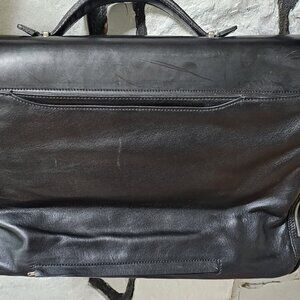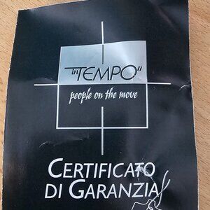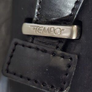 Italian black leather inTEMPO" briefcase. It is sturdy, quality leather with two sections, and a zipper section in between. There is an inside zipper pocket on one side and pen/pencil holders built-in on the other side. There are two large pockets in the front. There is a zipped back pocket (with additional zipper access on the bottom of the back of the bag), with a smaller pocket section on back. There is a pocket on both sides of the bag, one of those goes across the lower part of the back of the bag. The is a leather holder for one pen on the side of bag. It says inTEMPO" on the bottom of the case and on the metal of the handle. It is in good condition. Only two things I would like to point out. It has a tiny tear in the underside of flap. Does not affect function, see pics. The leather on the flap has light creases/wear from opening and closing, and bottom left of case, just normal wear. Very unique, classic and cool bag!