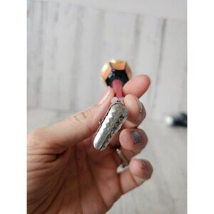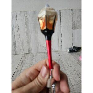 about 5.5 in tall with a diameter of 1.5, overall in good condition except for does have some of the red paint removed and one part on the base otherwise no other problems