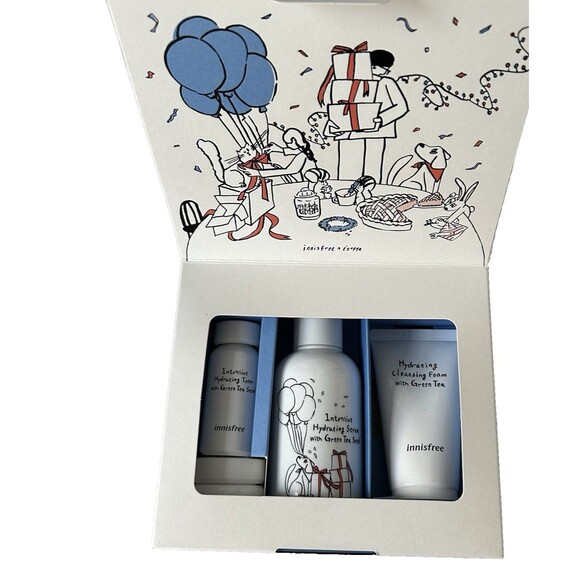 This SET is a complete skincare set designed for all skin types. This hydrating serum and travel-sized set includes a , toner, cleanser, and moisturizer, all formulated for deep hydration. The set is perfect for unisex use and features a refreshing green tea scent. Ideal for daily skincare routines, this set is a must-have for those looking to pamper their skin with effective and nourishing products from a trusted brand like Innisfree.