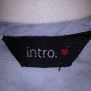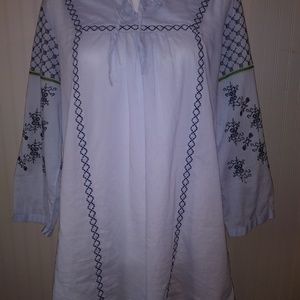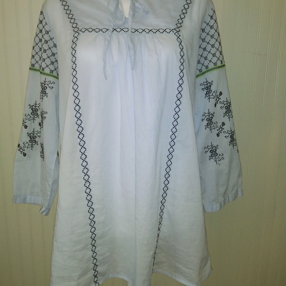 Light blue with black stitching and lime green accent on sleeves. Pleated front with a tie . Very very cute and in excellent condition. 100 % cotton. No flaws. There is no size on the shirt but it looks like an extra large. It is 22 in. front armpit to armpit. shoulder to shoulder is 16 in. Back shoulder to bottom hem is 29 in. Sorry for the poor lighting, trying to make it better.