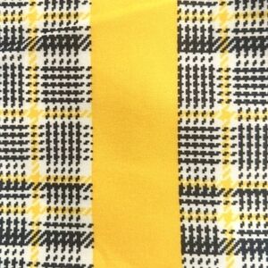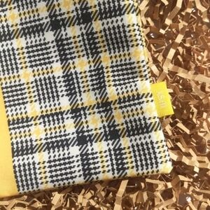 This small cosmetic bag is from September 2021. It is black, yellow, and white plaid with a wide yellow vertical stripe going down the center. It has a yellow drawstring that closes the bag. There is also a yellow tag on the corner of the bag that says IPSY. The inside of the bag is white. Super cute and convenient when traveling or separating products. Super cute print that is inspired by Cher's iconic plaid skirt suit from the 90's Clueless movie.