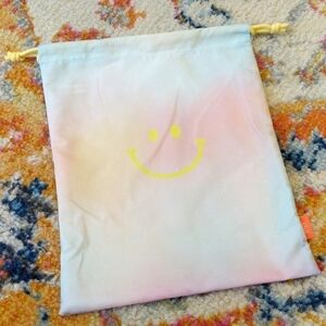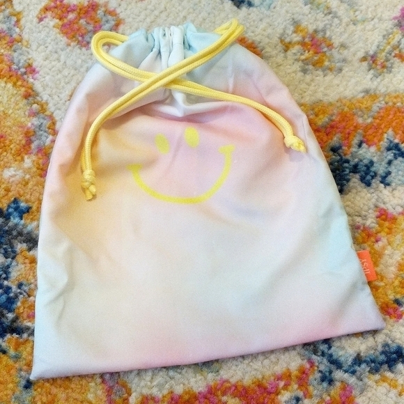 This small cosmetic bag is from January 2022. It has a pastel rainbow tie dye with a yellow smiley face on the front center. It has a yellow drawstring that closes the bag. There is a pink tag on the corner of the bag that says IPSY. The inside of the bag is white. Super cute and convenient when traveling or separating products. Fun hippie design!