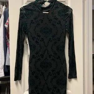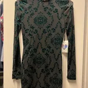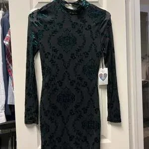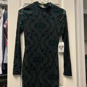 Iris Green Velvet Damask Bodycon Dress, Long Sleeve, Size Small — New with Tags. Featuring a beautiful emerald green velvet burnout pattern on a black mesh overlay. This form-fitting mini dress creates a stunning silhouette for evenings and events.