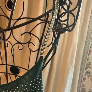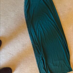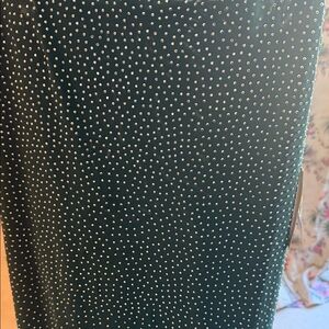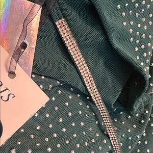 Sleek black dress with dense rhinestone embellishments. Smooth fabric with sparkling dot pattern. Versatile and eye-catching for evening wear.