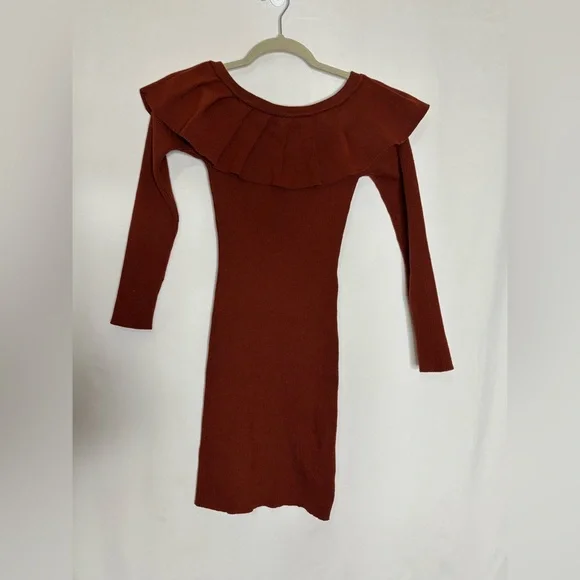 Step out in style with this rust colored ribbed ruffle dress. Rust color. Perfect for any occasion, this dress offers a chic and sophisticated look.