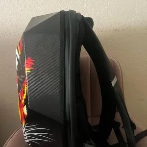 This is a hard-shell backpack designed for motorcyclists and scooter riders, featuring a distinctive look with LED eyes that can be programmed.