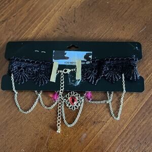 New on card isc Black lace choker necklace with light red beads and goldtone chains