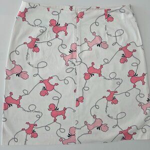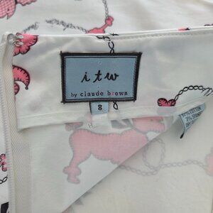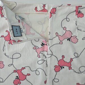 This is an i.t.w. by Claude Brown skirt size 8. Measures 15 1/2 inches across the waist and 20 inches long. There is a zipper in the middle back. White with different pink poodles all over and the words American Poodle scattered around. This one is RARE! No spots stains or holes, clean and ready to wear!