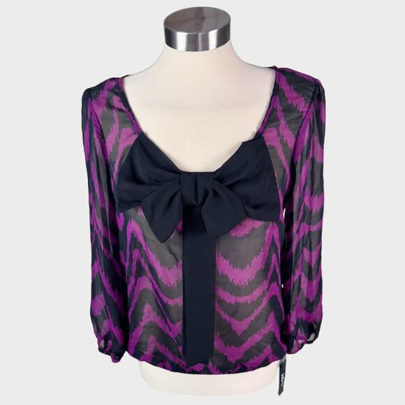 iz byer Large Purple Black Sheer Top Big Bow Front NEW NWT