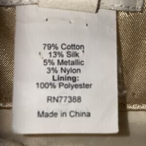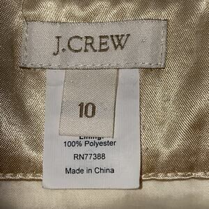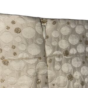 The J Crew Gold and Cream Pencil Sheath Skirt in size 10 features a stylish metallic pattern with circles/bubbles, perfect for both casual and business occasions. Made from a blend of cotton, silk nylon, and metallic material, this knee-length skirt is designed with a zip closure and a straight pencil style. The skirt is lined and suitable for all seasons, making it a versatile and chic addition to any woman's wardrobe.
