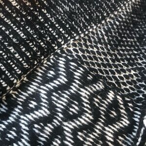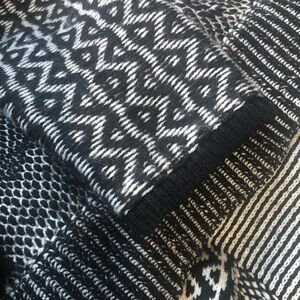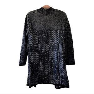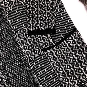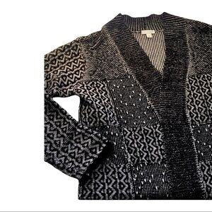 Black and white multi patterned duster cardigan sweater. Open front with pockets