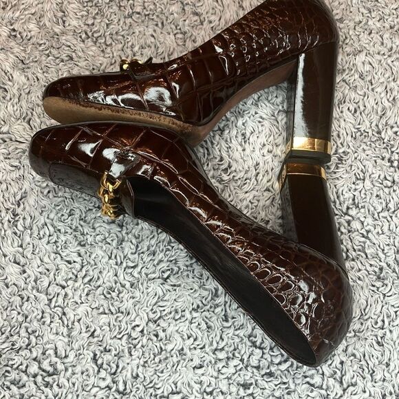j VINCENT 8.5 Preppy Brown Patent Leather Chain Detail Block Heel w/Gold Trim