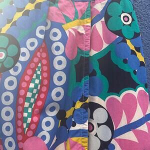 fun and boldly printed cotton / swooped faux wrap front / back zip and hook closure / excellent preowned condition