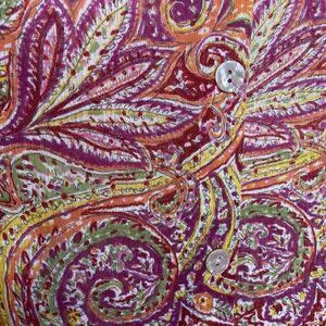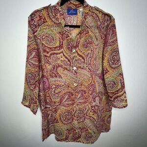 The j.h. collectibles button-up blouse is a stylish and versatile piece perfect for women size L. Featuring a bohemian paisley festival minimalist design in a trendy red color, this blouse is sure to add a pop of personality to any outfit. Made by the brand j.h. collectibles, known for their quality and attention to detail, this blouse is a must-have for any fashion-forward wardrobe. Pearlized buttons, 3/4 sleeves, tunic style. Polyester. Colors: pink, red, yellow, green, orange in a paisley design. Side vents/ slits at cuffs and each lower side of top. Lightweight, sheer material. Usually worn over a tank top. Lovely blouse!