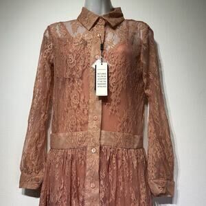 New with tags, romantic lace shirt dress in beautiful vintage pink color. Includes separate short slip. Full button front and cuffs.
