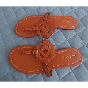 The product is a pair of J McLaughlin slip-on sandals in an orange color, designed for women in size 8M. These sandals feature a low heel height for comfort and are suitable for casual or business occasions. The outsole is made of fabric, with a faux leather lining and upper material. The design of the sandals is stylish and versatile, suitable for the summer, fall, and spring seasons. The J McLaughlin brand is known for its bohemian and preppy themes, making these sandals a fashionable choice for any wardrobe.