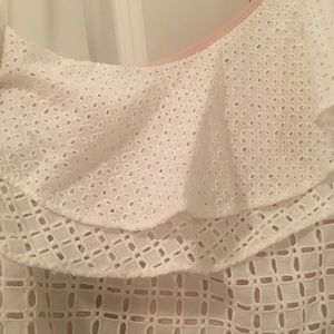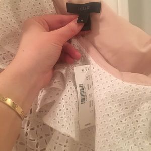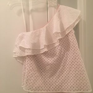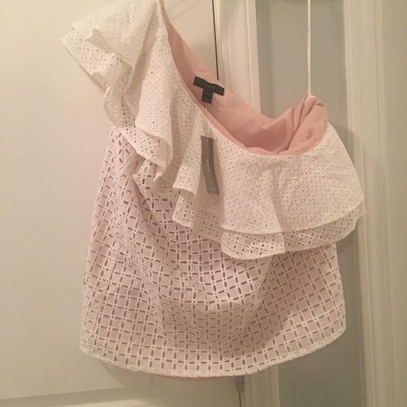 Brand new J.Crew one shoulder top. Never before worn ruffle trim top with side zip closure. Lace fabric with nude lining!