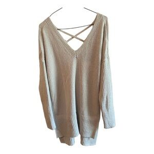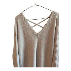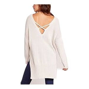 Things are getting warmer in this V-neck wide ribbed sweater with side slits and crisscross back detailing.