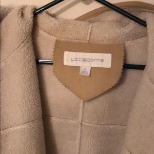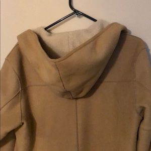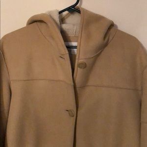 tan jacket, fur on inside. very warm, slightly used. has a hood and pockets