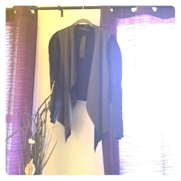 faux leather arms and cardigan like fit across the chest. The sleeves are crochet like cross stitched down the arm and down near the underarm